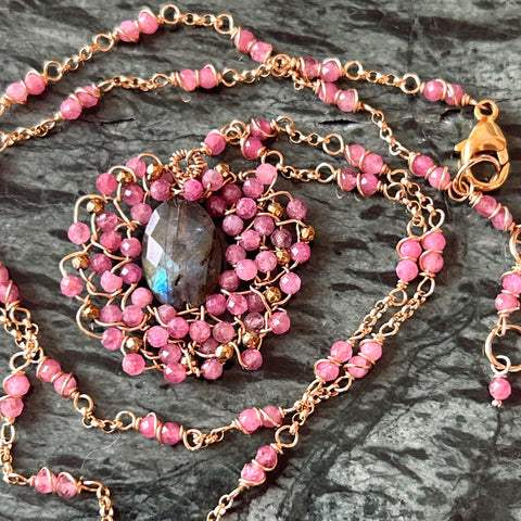 The Posy Amulet's magic is a simple, whispered reminder: "Take a breath". A breath is instantly transformational, quietly assuring, and humbly empowering. Posy's magic goes further - adding joy, enchantment, and delight to each moment. Labradorite's mesmerizing and playful beauty invokes wonder and honors the sacred act of seeing as an expression of love. Pink tourmalines surround the magic with love, love, love and invoke peace, peace, peace.